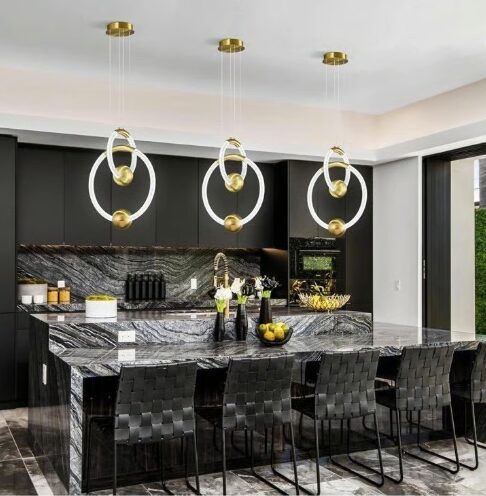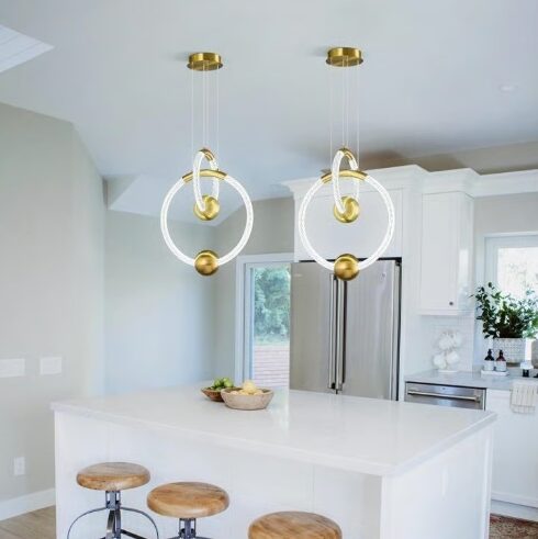تأتي النجفة بتكوين دائري متشابك بإبداع، مزودة بتشطيبات ذهبية فاخرة وإضاءة LED ناعمة تضفي دفئًا وأناقة على أي مساحة.
