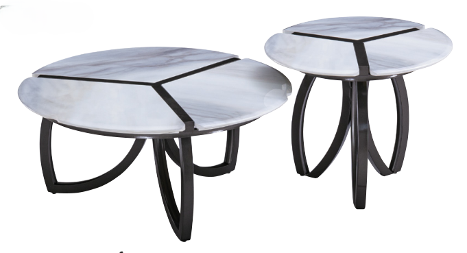 - يتميز الطقم بطاولة رئيسية وطاولة جانبية مصممة بتفاصيل هندسية دقيقة، حيث تجمع بين سطح أبيض بورسلين بإطار معدني أسود يعكس جمال البساطة والتفرد.