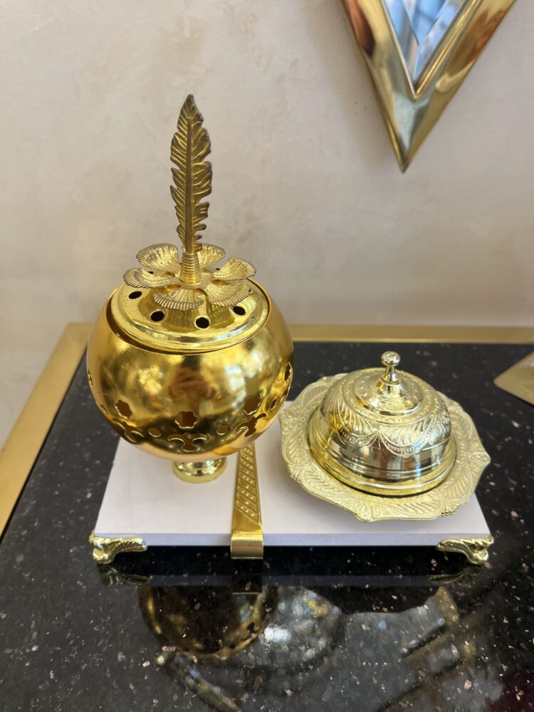امنحي منزلك لمسة من الفخامة والأصالة مع طقم المبخرة وعلبة البخور الذهبي المصمم بعناية ليجمع بين الجمال والوظيفة. يتميز الطقم بتفاصيل راقية ولمعان جذاب، مع قاعدة أنيقة تضيف ثباتًا وشكلًا ديكوريًا فاخرًا.