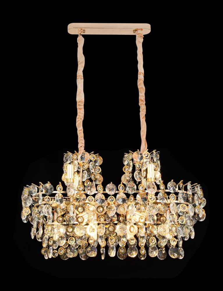 نجفة كريستالية فاخرة بتصميم أنيق يجمع بين الفخامة الكلاسيكية واللمسة العصرية، مصنوعة بدقة من الكريستال اللامع عالي النقاء مع لمسات ذهبية براقة تعكس الضوء بشكل مبهر وتضفي دفئاً ورفاهية على أي مساحة.