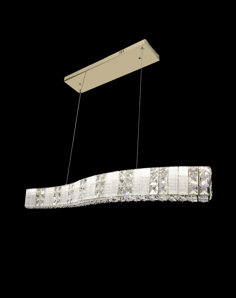 2. تأتي بشكل مستطيل مموج مميز مع كريستالات شفافة تتلألأ بإضاءة دافئة، مما يضيف لمسة من الرقي والراحة للمساحة.