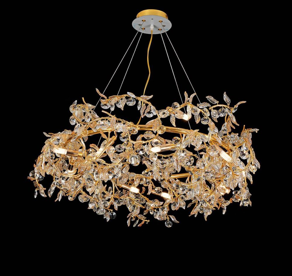 التحفة الفنية التي تجمع بين الفخامة واللمسة الطبيعية الساحرة. تصميمها المميز الذي ينسجم بين اللون الذهبى المتألق والكريستال اللامع، يجعلها الخيار المثالي لكل من يبحث عن إضافة لمسة راقية إلى ديكوره الداخلي.