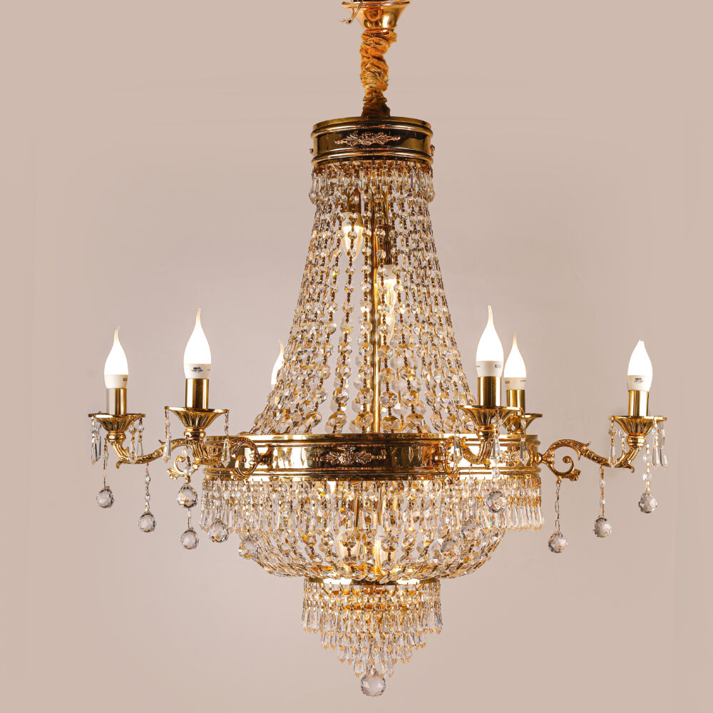 تصميم كلاسيكي فاخر يجمع بين هيكل معدني مطلي باللون الذهبي اللامع وتفاصيل من الكريستال المضيء الذي يعكس الإضاءة بشكل مبهر ليمنحك أجواء راقية تضاهي القصور.