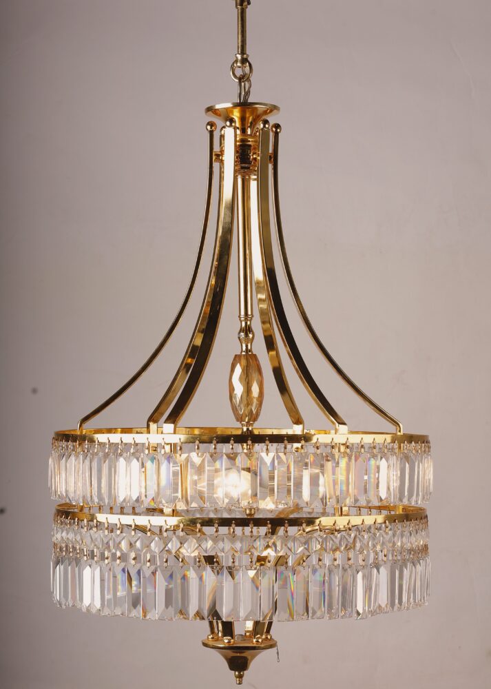 أضف لمسة من الجرأة والفخامة العصرية مع هذه النجفة الكلاسيك الفريدة بتصميم شريط كريستال الذهبي المتناغم مع كريستال العصفور البراق، لتصبح قطعة ديكور استثنائية تضيء المكان بسحرها.