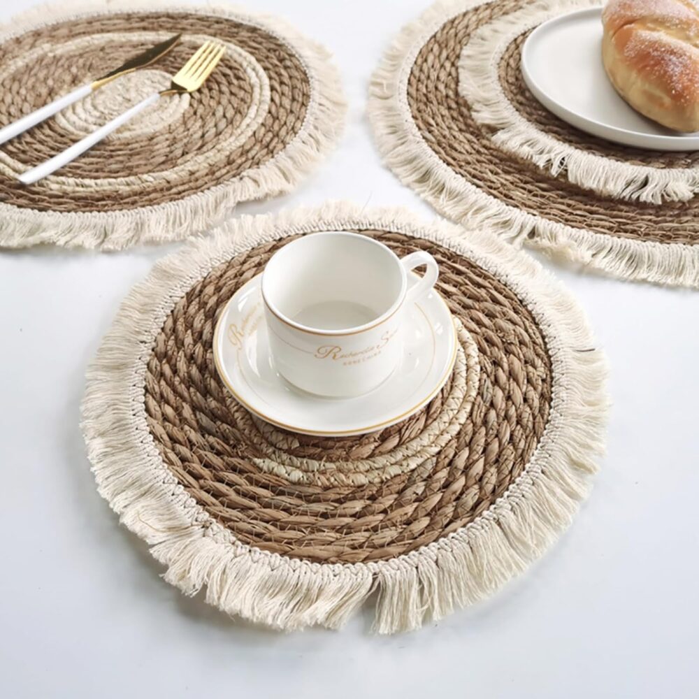 - كوستر دائري أنيق مصنوع من خامات طبيعية منسوجة بعناية ليضيف لمسة من الدفء والجمال على طاولتك.
