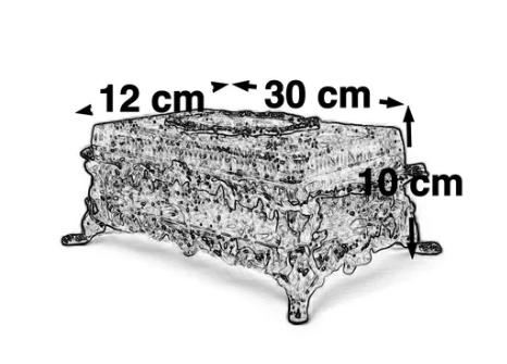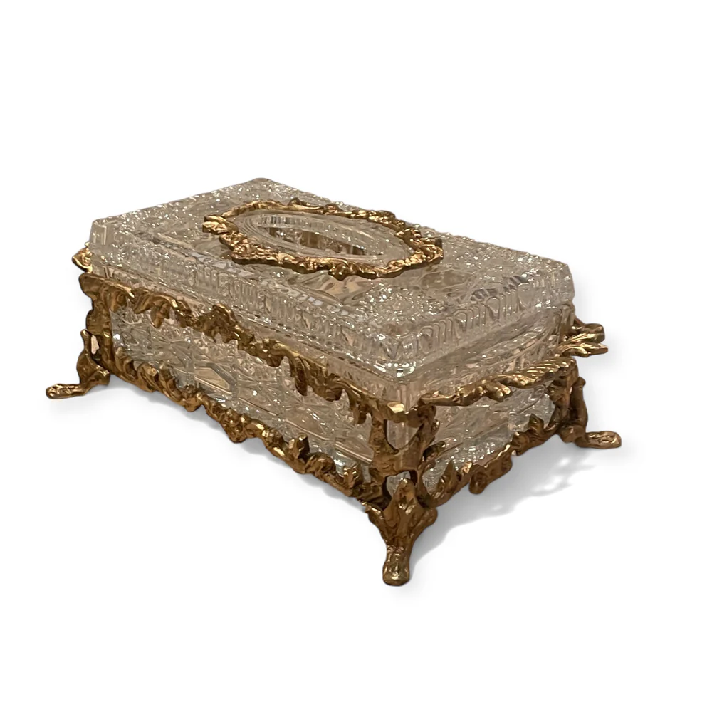 1. علبة كريستالية فاخرة بتصميم مستطيل أنيق، ترتكز على قاعدة نحاس مذهبة بزخارف فنية راقية تعكس الفخامة الكلاسيكية.