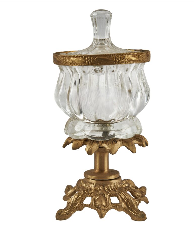 - ترتكز على قاعدة نحاسية مطلية بالبرونز بتصميم زخرفي راقٍ يضفي لمسة فنية على أي طاولة.