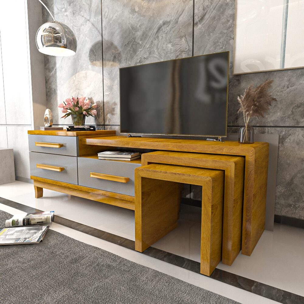 ترابيزة الشاشة المعروضة تجمع بين الأناقة العصرية والعملية، مصممة بخطوط انسيابية وبمزيج متناسق من الخشب الفاخر مع الأدراج لتمنح ديكور منزلك لمسة راقية.