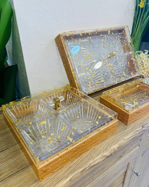 مصنوعة من خامة خشبية طبيعية بإطار متين مضاف إليها أغطية أكريليك شفافة مزينة بقطع ذهبية تمنحها لمسة فاخرة.
