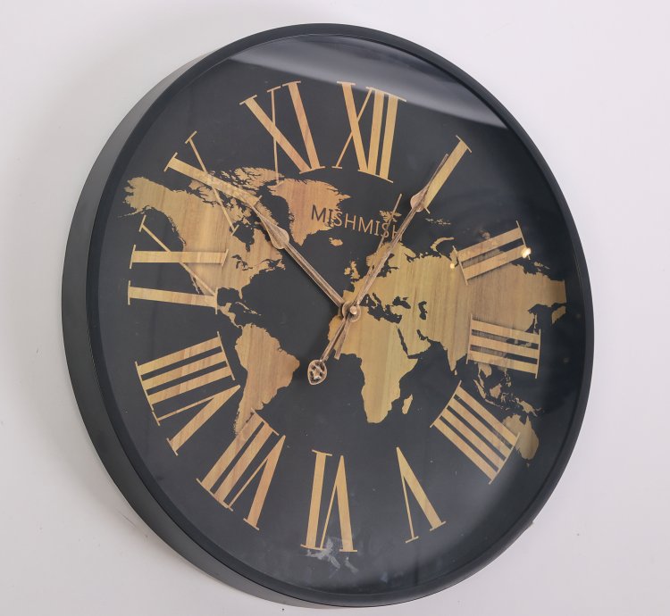 ساعة حائط أنيقة بتصميم فاخر يجمع بين الكلاسيكية والعصرية، تتميز بخلفية على شكل خريطة العالم بلون ذهبي لامع يضفي لمسة راقية على أي ديكور. الأرقام الرومانية الكبيرة والعقارب الذهبية تضيف مظهراً فخماً وسهل القراءة. إطار الساعة باللون الأسود يمنحها توازناً جمالياً جذاباً يجعلها قطعة ديكور مميزة للمكاتب أو غرف المعيشة أو الاستقبال.